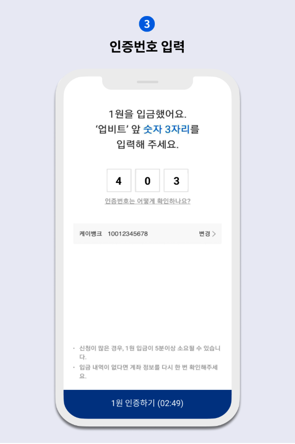 2. 입력한 은행 계좌로 1원이 송금됩니다. 송금된 1원 내역의 입금자명의 '업비트' 앞에 노출된 세 자리 숫자를 인증번호 확인