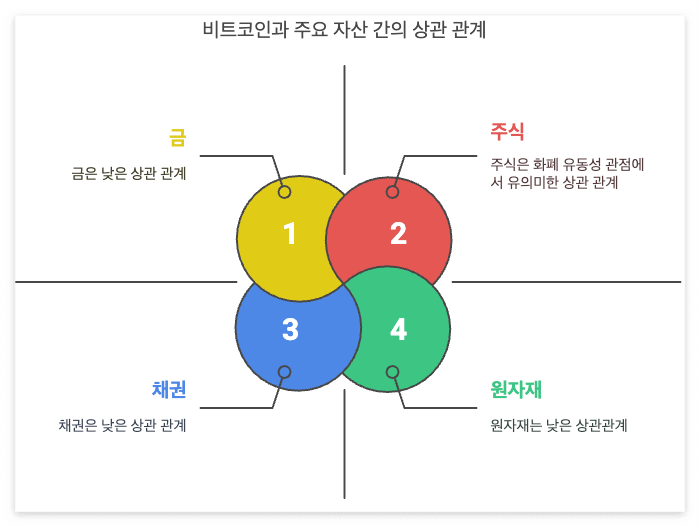 비트코인과 주요 자산(주식, 채권, 금, 원자재 등) 간의 상관성은 시장 상황에 따라 변동할 수 있습니다.